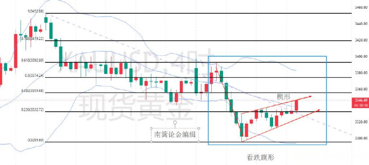 日内呢,其实有个形态来着。小时图中的上涨楔形,其上轨恰好位于3343一带,下轨呢,则是3320—25区间内。而独特之初在于,这个形态结合周一从3395跌下的波段,有构成看跌旗形的潜力。